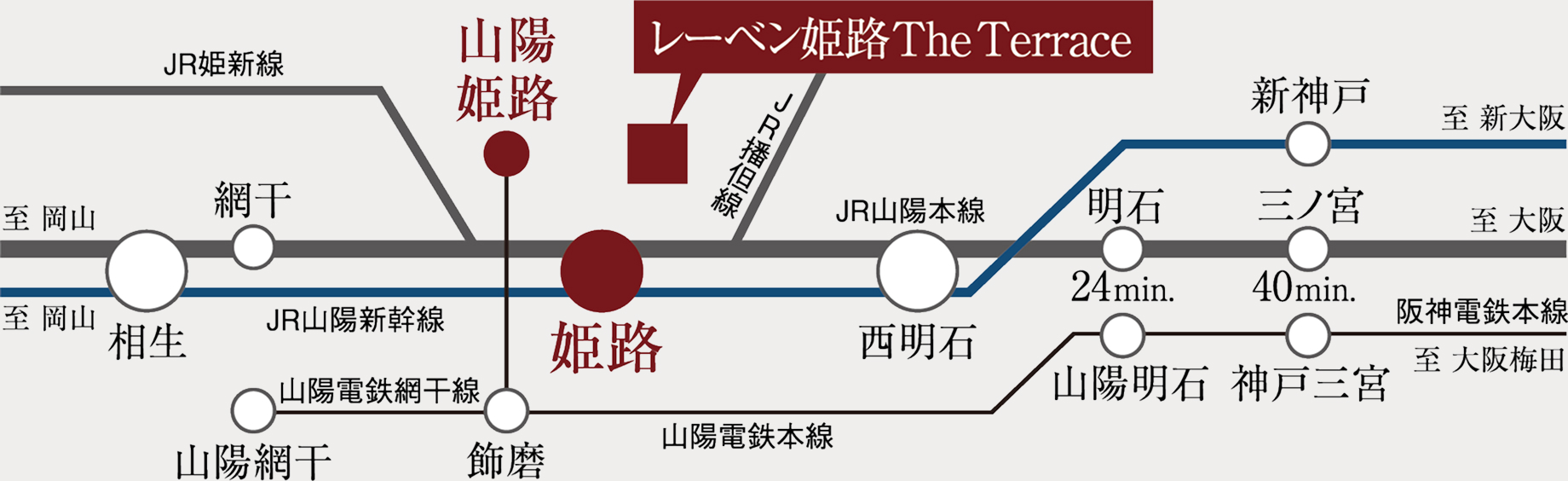JR山陽本線、播但線、姫新線、山陽新幹線の「姫路」駅と、山陽電鉄本線「山陽姫路」駅へ徒歩7分。「三ノ宮」駅や「大阪」駅方面はもちろん、「東京」駅や「博多」駅方面への旅行・出張もスムーズに。2駅5路線のマルチアクセスが、暮らしのフィールドを広げます。