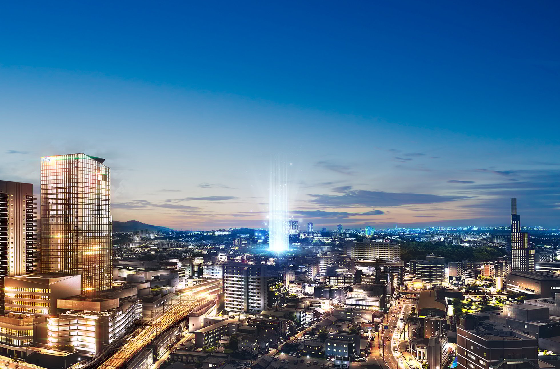 ※掲載の航空写真は計画地周辺を2025年5月に撮影したものにCG加工したもので実際とは異なります。光の柱は現地の位置を表現したもので建物の規模や高さを示すものではありません。