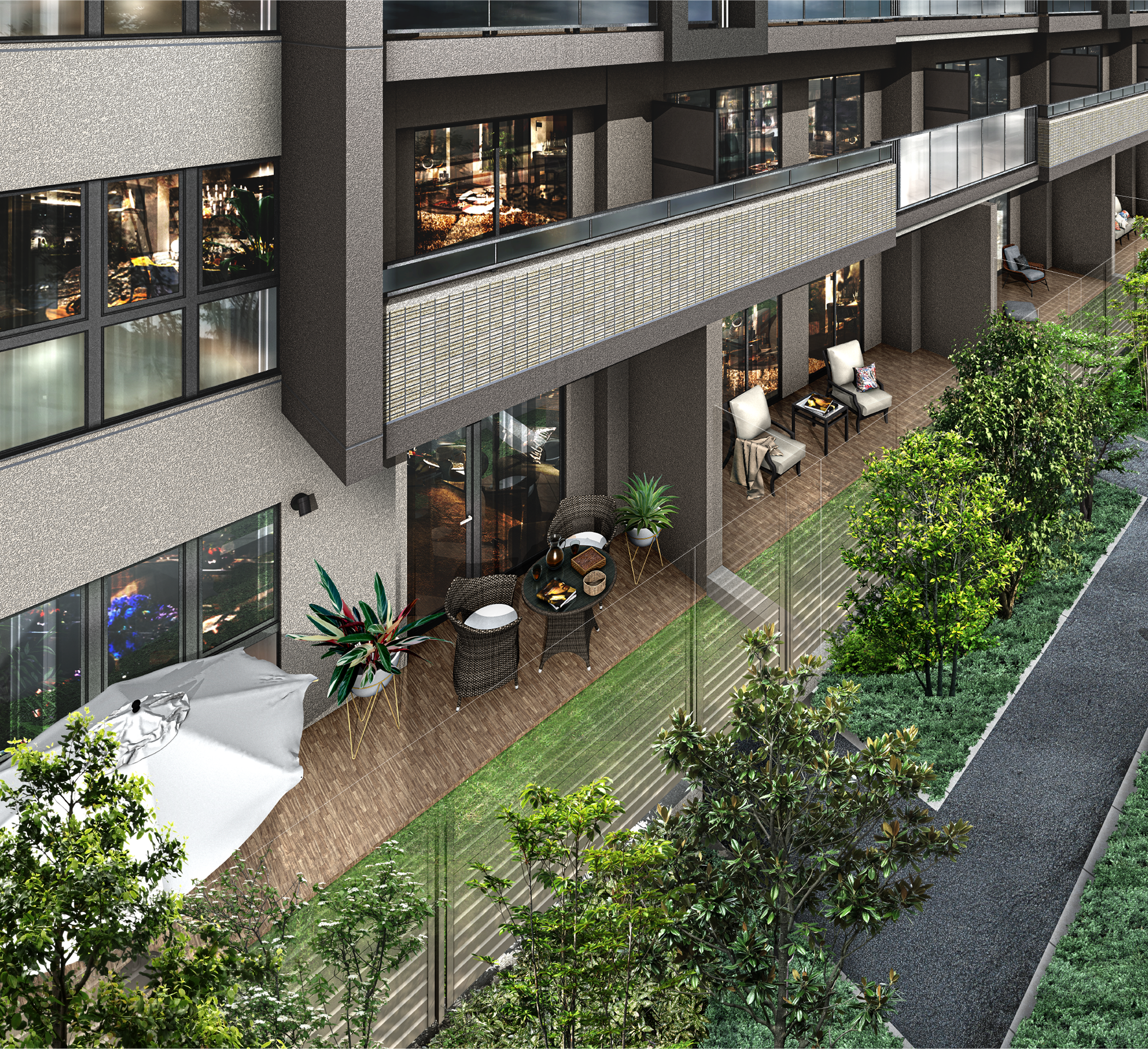 南向きの敷地配置を活かした専用庭付の1階住戸として、