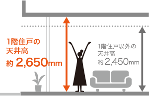 1階住戸のリビング・ダイニングの天井高は約2.65mを確保。南向きのやわらかな光に満たされる空間に、いっそうの開放感と心地よさをもたらします。