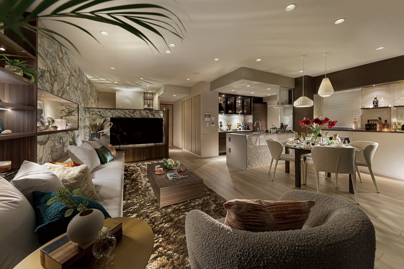 朝の華やぎから、夜は穏やかな静寂へと変わるリビング・ダイニング。
