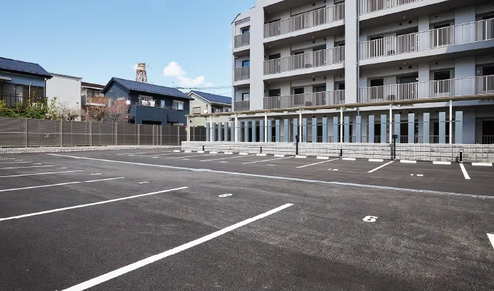 機械操作が不要な平置駐車場を17台分確保。車の出し入れやお子さまの乗降もスムーズで車高を気にせずに車が選べます。