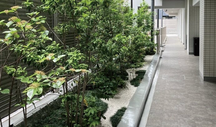 敷地東側の1階専用テラスと川越街道の間や、南側となるアプローチ周りに豊かな植栽帯を計画。緑潤う常緑樹と季節の草花などを配置し、四季折々に自然の豊かさを感じてもらえるよう配慮しました。