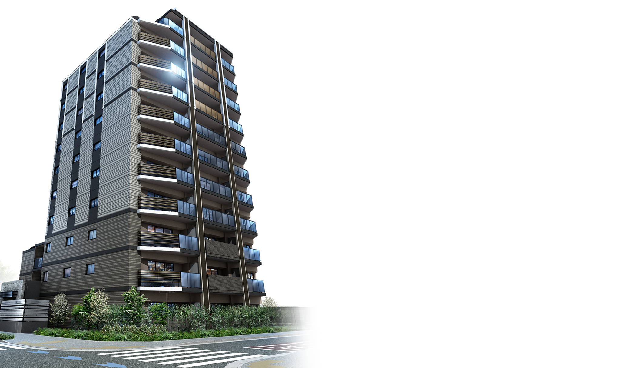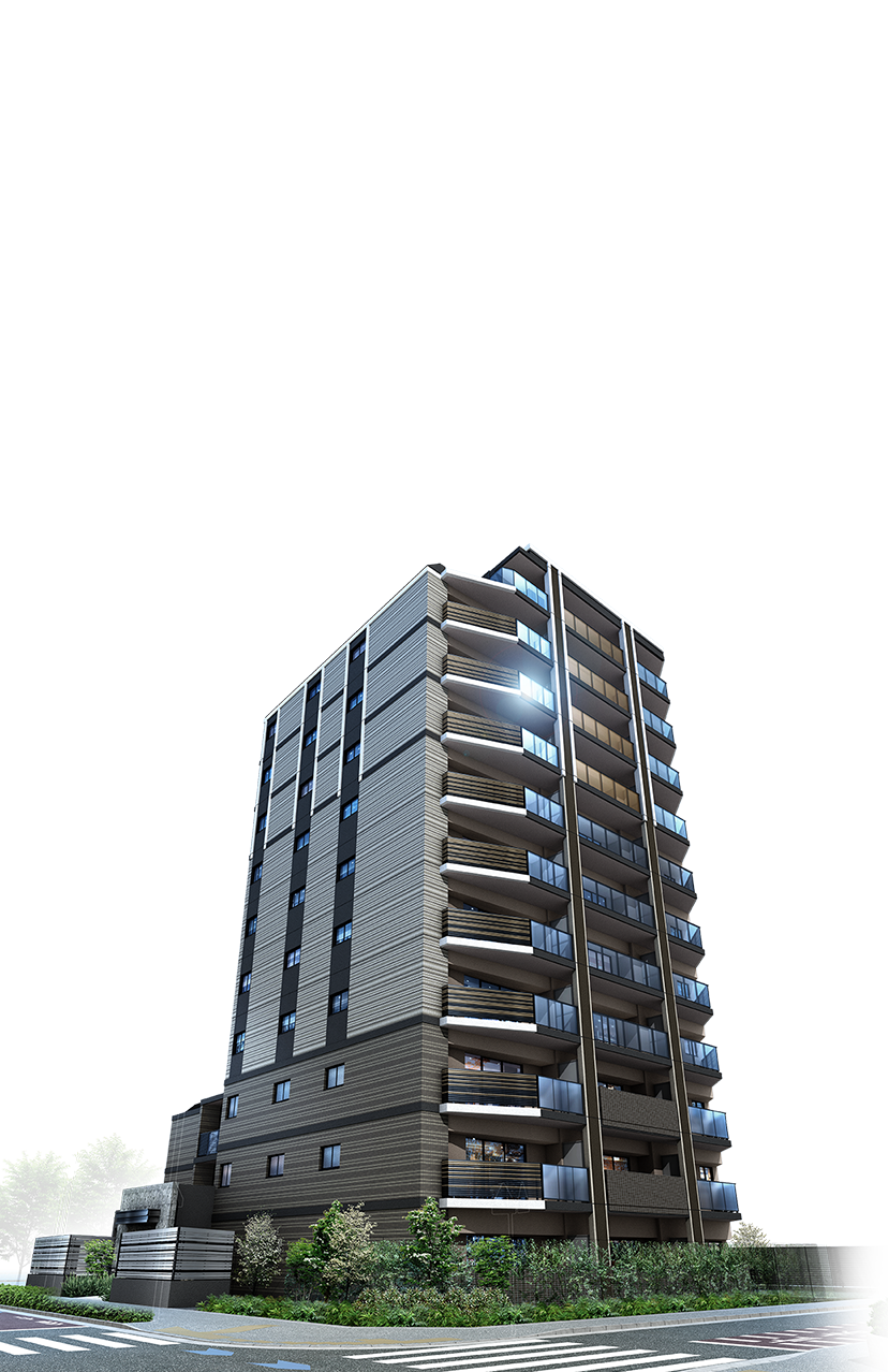 ※掲載の外観完成予想CGは計画段階の図面を基に描き起こしたもので実際とは異なる場合があります。なお、外観の細部及び設備機器等は一部省略又は簡略化しております。植栽は計画段階のもので樹種・設定位置・植高・本数等は変更となる場合があります。竣工時には完成予想CG程度には成長しておりません。