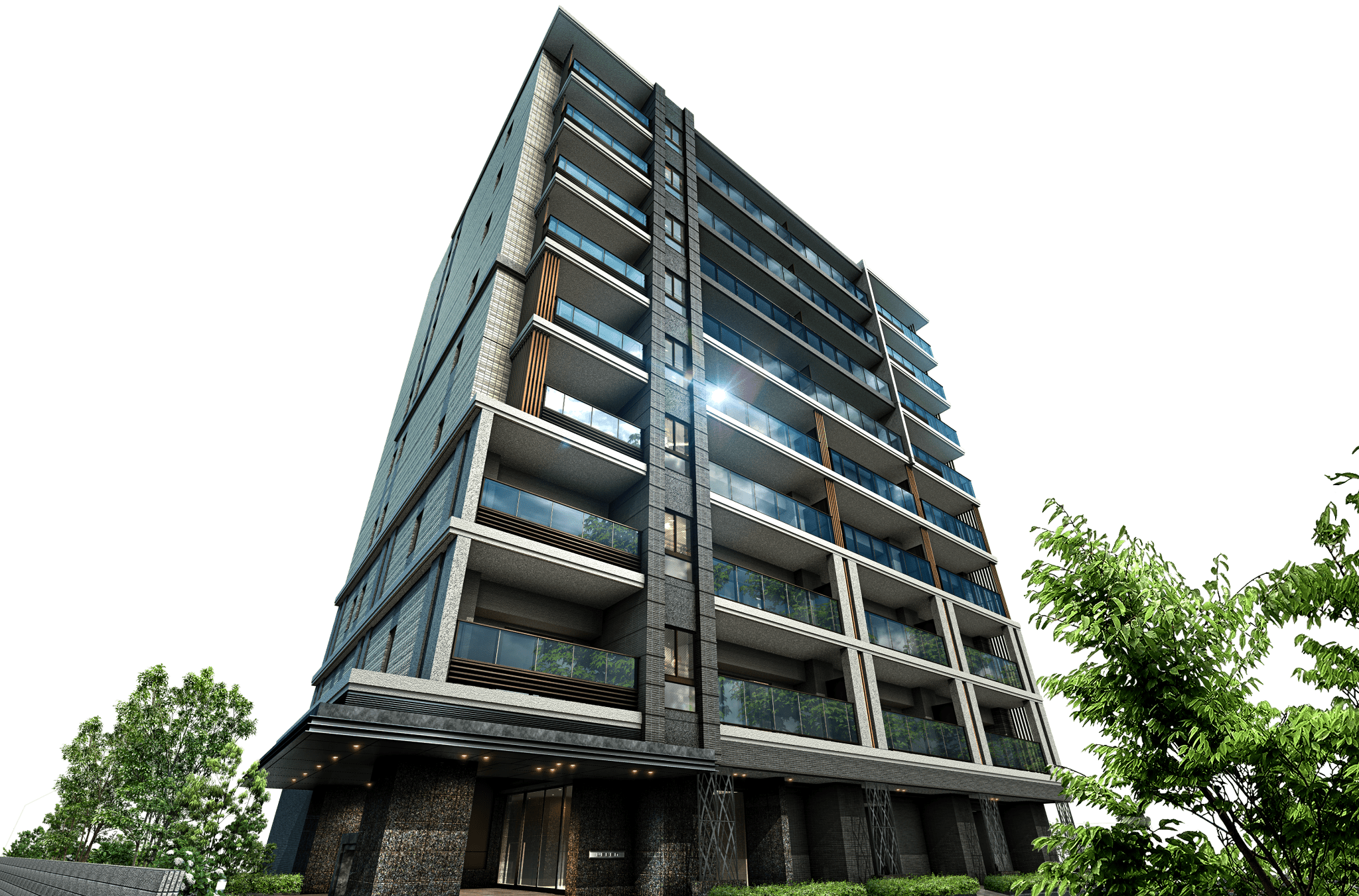 ※掲載の外観完成予想CGは計画段階の図面を基に描き起こしたもので実際とは異なる場合があります。なお、外観の細部及び設備機器等は一部省略又は簡略化しております。植栽は計画段階のもので樹種・設定位置・植高・本数等は変更となる場合があります。竣工時には完成予想CG程度には成長しておりません。