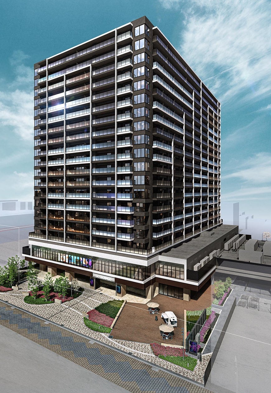 ※掲載の外観完成予想CGは計画段階の図面を基に描き起こしたもので実際とは異なる場合があります。なお、外観の細部及び設備機器等は一部省略又は簡略化しております。植栽は計画段階のもので樹種・設定位置・植高・本数等は変更となる場合があります。竣工時には完成予想CG程度には成長しておりません。