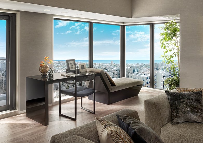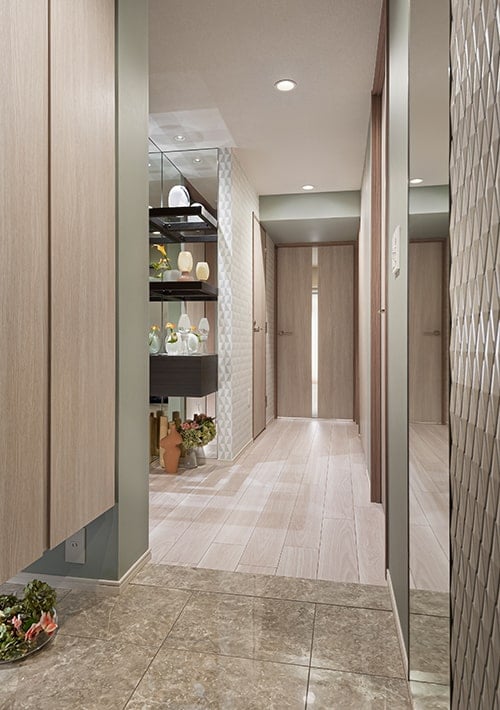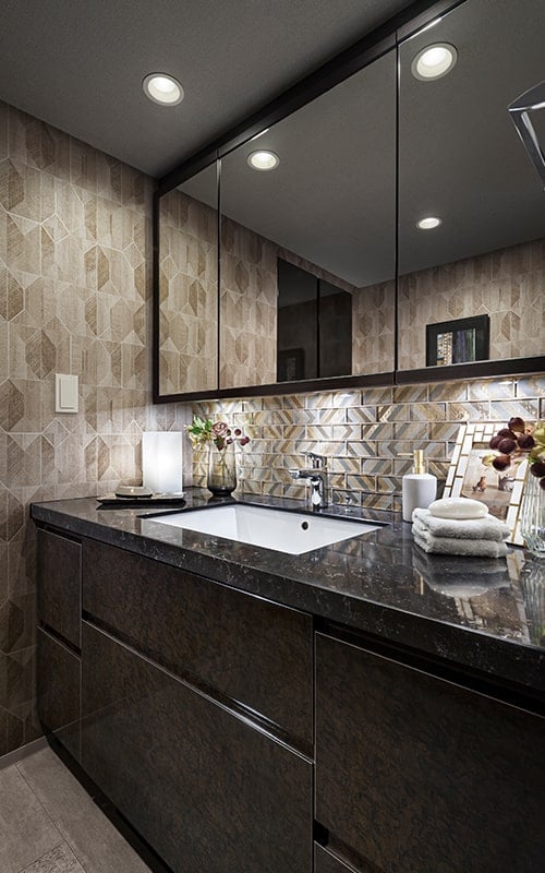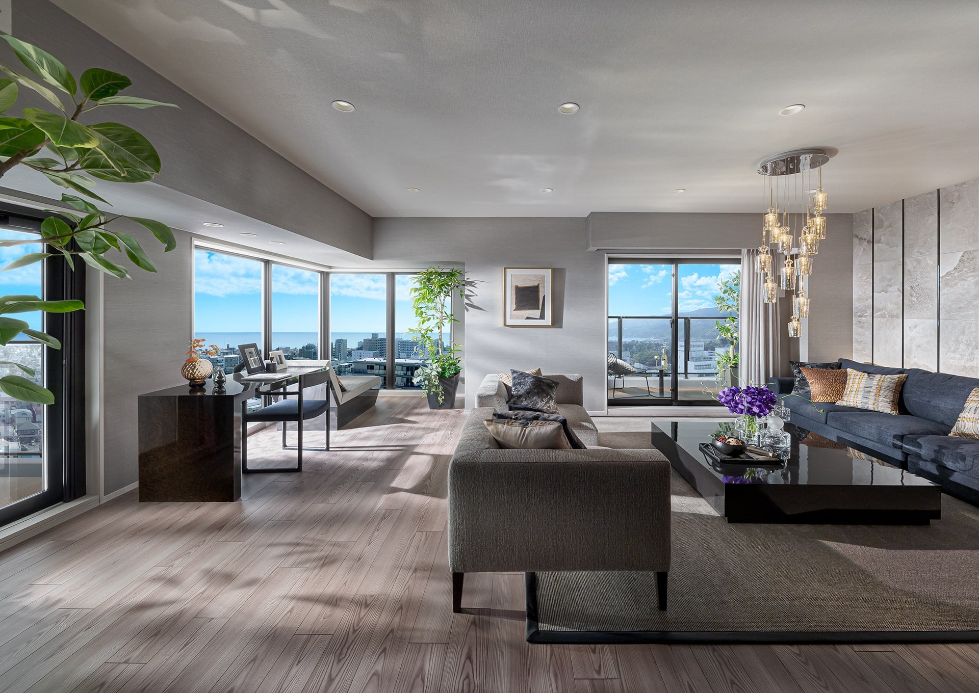 ※掲載のモデルルーム写真は「PKタイプ、Fタイプモデルルームプラン」をそれぞれ2025年3月に撮影したもので一部オプション等が含まれます。また、設備・仕様等はタイプにより異なる場合があります。家具・調度品等は販売価格に含まれておりません。実際と質感・色などの見え方が異なる場合があります。また、現地17階相当から撮影(2024年10月)した眺望写真を合成、加工したもので実際の住戸からの眺望とは異なります。眺望は階数・住戸により異なります。眺望・周辺環境は今後変わる可能性があり、将来にわたって保証されるものではありません。