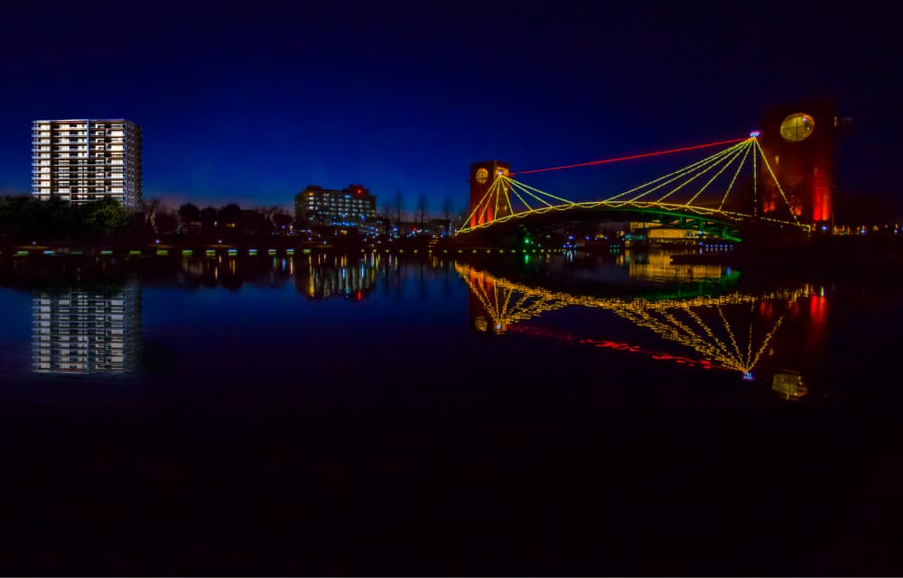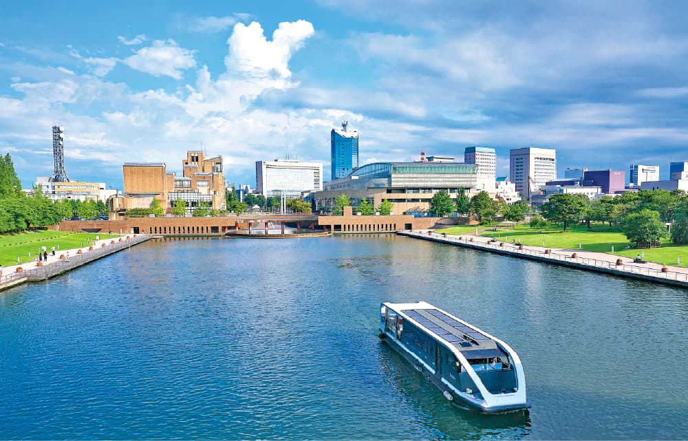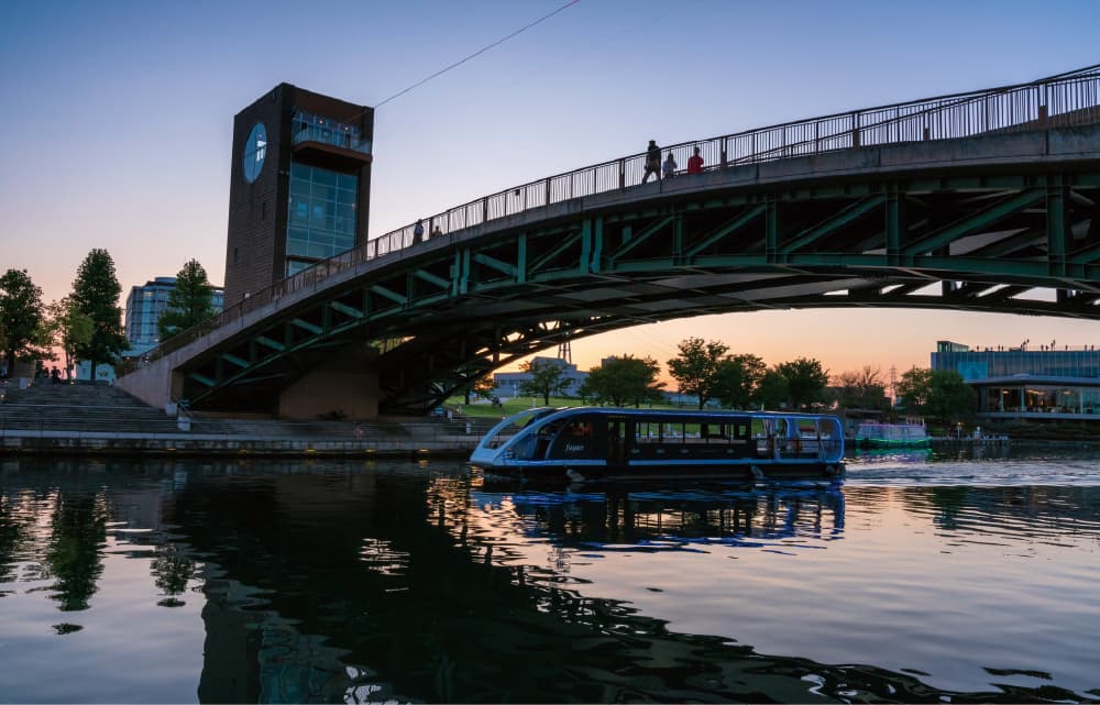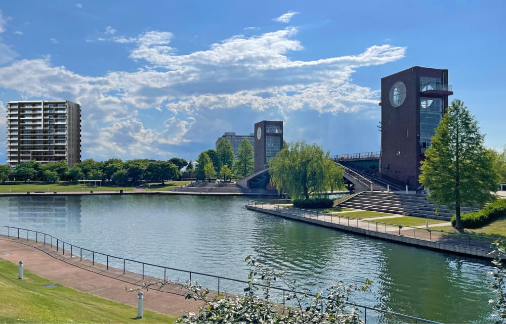 泉と滝の広場とならぶ富岩運河環水公園のシンボル施設です。両端のエレベーターを備えた展望塔からは、富岩運河環水公園全体とともに、立山連峰も一望できます。