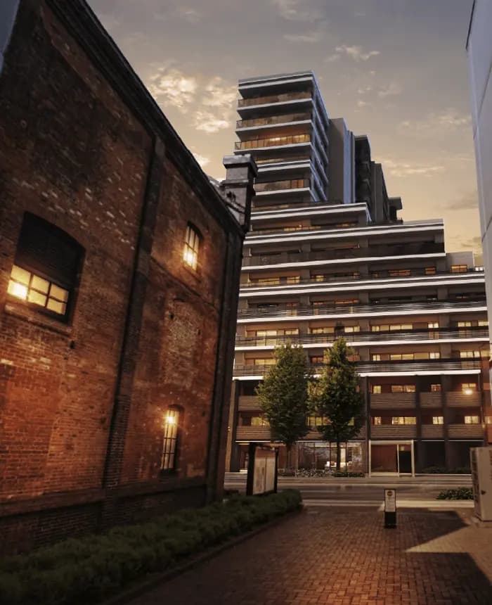 都市の過去が息づく赤レンガと、これからの骨格が、ひとつの視線で向き合う。